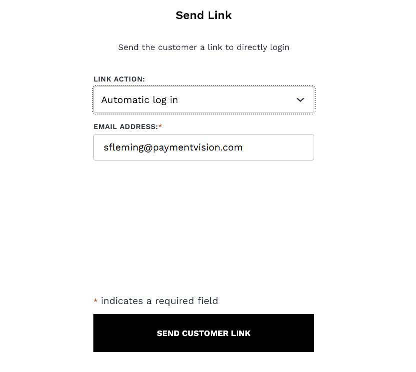 - When clicked, a Send Customer Link screen is presented